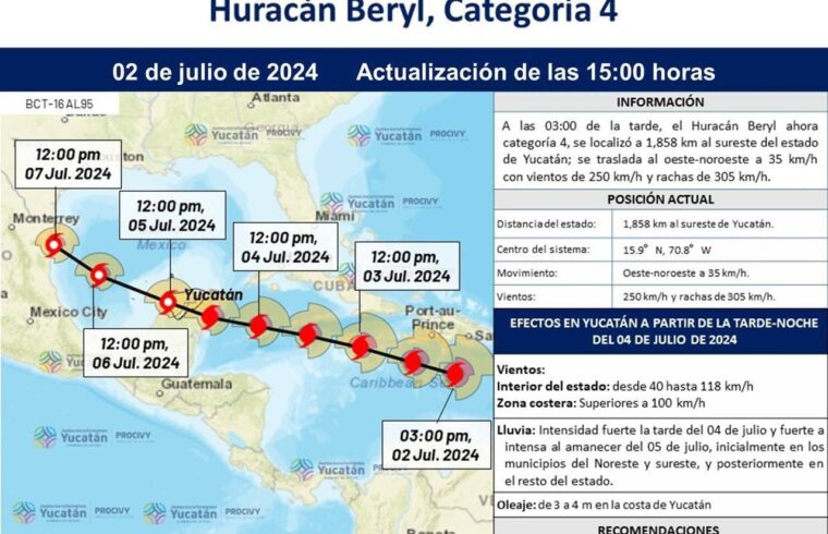 Mérida, 2 de julio de 2024.- Ante la aproximación del huracán “Beryl” a Yucatán, ubicado esta tarde a mil 858 km al sureste del estado con vientos de categoría 4, de 250 km/h y rachas de 305 km/h, la Coordinación Estatal de Protección Civil (Procivy), llama a la población a tomar sus precauciones, resguardarse en sus domicilios o en su caso acudir a los refugios temporales.