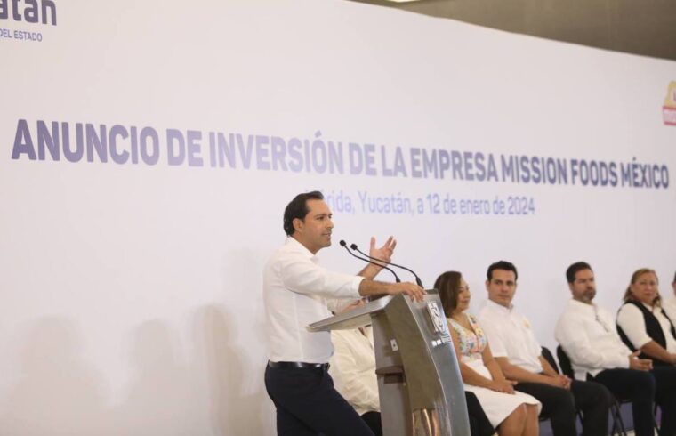 Mérida, Yucatán, 12 de enero de 2024.- Llegarán más empleos mejor pagados para las y los yucatecos que viven en el interior del estado, luego de que el Gobernador Mauricio Vila Dosal anuncie la inversión de la empresa Mission Food de México para la instalación de una planta de producción de productos de maíz en el municipio de Hunucmá.