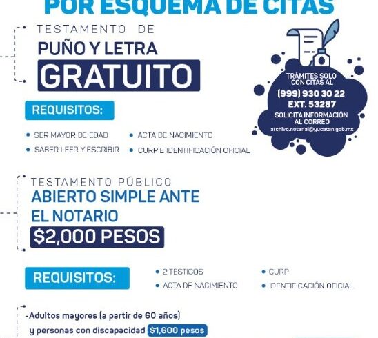 De esta manera, tramitar un testamento ológrafo, conocido popularmente como testamento de puño y letra, será completamente gratuito, mientras que en el caso del testamento ante Notario Público sólo deberá cubrirse el costo que el Colegio Notarial de Yucatán estableció para este año que será de 2,000 pesos.