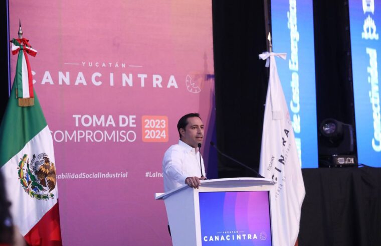 Mérida, Yucatán, 19 de abril de 2023.- Tenemos que aprovechar juntos el gran momento que vive Yucatán para sentar las bases de la infraestructura que necesita para que este crecimiento se vuelva sostenible en los próximos 30 años, afirmó el Gobernador Mauricio Vila Dosal durante la ceremonia de toma de compromiso de la Cámara Nacional de la Industria de Transformación (Canacintra) delegación Yucatán para el periodo 2023-2024.