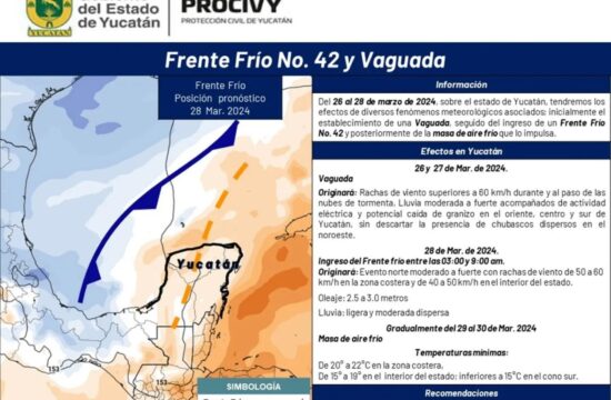 En las próximas 24 horas, en Yucatán se prevé cielo parcialmente nublado a nublado, con probabilidad de tormentas fuertes a puntuales muy fuertes en el oriente y sur del estado, así como intervalos de chubascos…