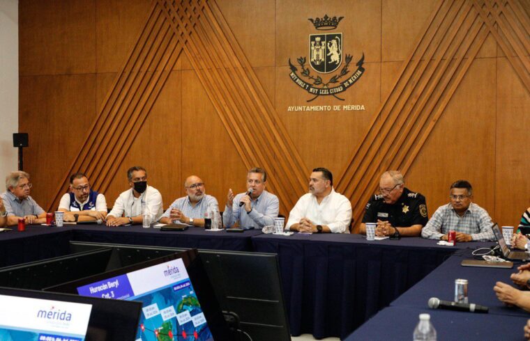 Mérida, Yucatán, 4 de julio de 2024.- El Ayuntamiento de Mérida activó el protocolo de Protección Civil ante la proximidad del huracán Beryl a territorio yucateco, para lo cual desplegó un operativo que incluye la sesión permanente del Consejo Municipal de Protección Civil, la apertura de los refugios temporales, redoblar la seguridad policial en el centro histórico y abrir 24 horas los canales de comunicación para recibir y atender reportes y solicitudes ciudadanas, anunció el Alcalde Alejandro Ruz Castro.