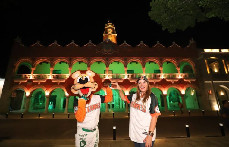 El Palacio Municipal de Mérida se iluminó de verde y naranja en apoyo a los Leones de Yucatán rumbo a la sexta copa de la Liga Mexicana de Béisbol.