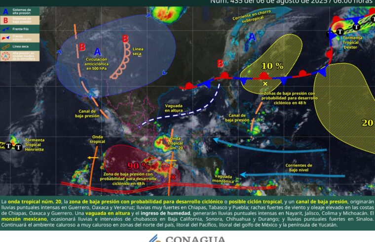 Se prevé que debido al establecimiento de una vaguada térmica, aunado al ingreso de aire marítimo tropical e inestabilidad en la tropósfera alta, se prevén condiciones favorables para el desarrollo de tormentas vespertinas a nocturnas, especialmente sobre los estadosl de Campeche y Yucatán, donde se esperan intervalos de chubascos con tormentas localmente
