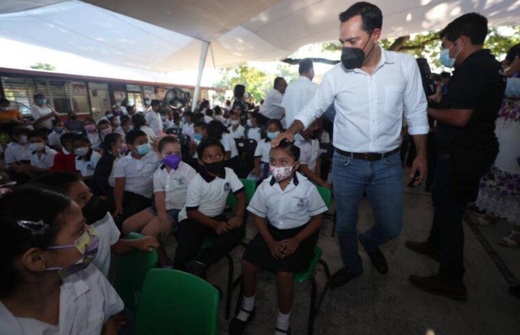 El gobernador Mauricio Vila Dosal visitó la escuela “Bernabé Argáez Milanés”, en la colonia Chuburná de Hidalgo, donde continuó con la entrega de 267,931 paquetes de útiles escolares para estudiantes del nivel básico, así como 206,534 kits y desayunos escolares fríos y calientes, destinados a un total de 118,512 niñas y niños, de preescolar, primero y segundo grados, en todo el territorio estatal.