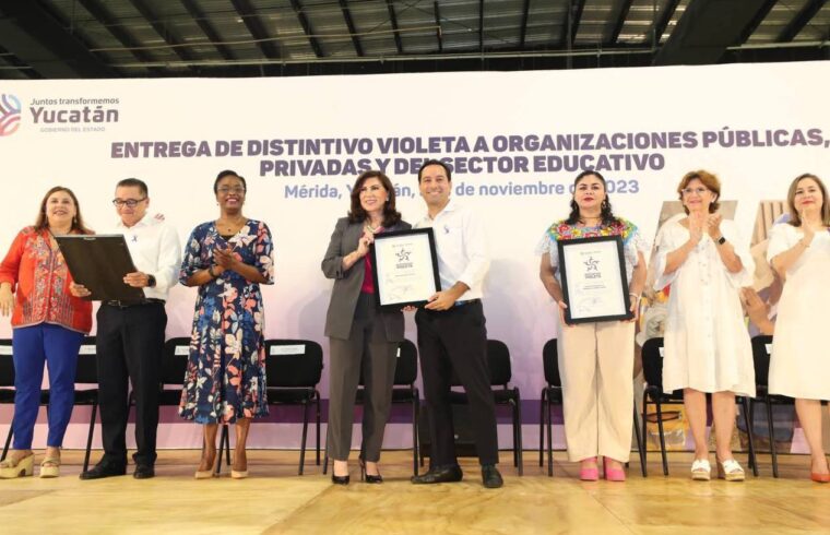 Mérida, Yucatán, 21 de noviembre de 2023.- Para seguir avanzando en la prevención de la violencia contra las mujeres, el Gobernador Mauricio Vila Dosal entregó Distintivos Violetas a 94 instituciones públicas, educativas, organizaciones y cámaras empresariales, con lo que cada vez son más las yucatecas que cuentan con espacios seguros para empoderarse y desarrollarse mejor.