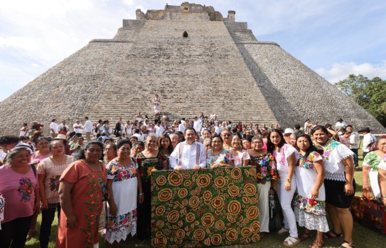 Desde la zona arqueológica de Uxmal, que este año celebró 28 años de ser patrimonio de la humanidad, el Gobernador, junto al director general del Instituto Nacional de Antropología e Historia (INAH), Diego Prieto Hernández, entregó a 200 bordadoras de 12 municipios del estado certificados como transmisoras de los saberes culturales que son patrimonio y base de la organización comunitaria de la región.
