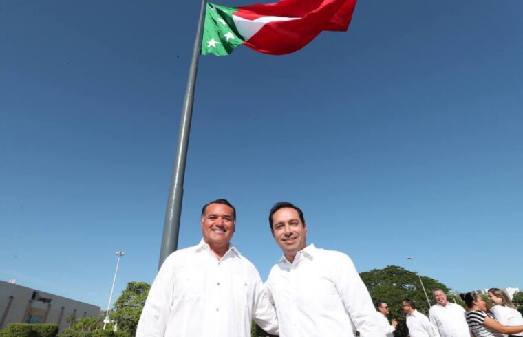 Mérida, Yucatán, 21 de agosto de 2023.- Por vez primera, desde 1841, la bandera de Yucatán volvió a ondear, ahora a la par de la bandera de México, luego de que el Gobernador Mauricio Vila Dosal encabezó el izamiento del lábaro yucateco, símbolo distintivo de nuestra entidad que refrenda el compromiso del Estado con el Pacto Federal y fomenta el patrimonio cultural, historia e identidad de nuestro pueblo.
