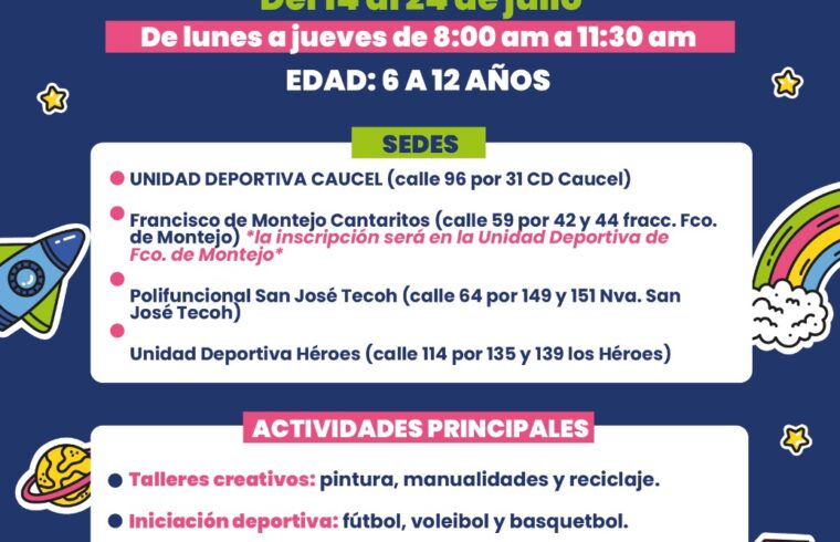 Mérida, Yucatán, lunes 30 de junio de 2025.- Con una amplia variedad de actividades, diseñadas para fomentar la creatividad, la imaginación y el trabajo en equipo, el Ayuntamiento de Mérida realizará los “Cursos de Verano Mérida 2025” y “Verano Aventuras”, iniciativas para promover la recreación, el aprendizaje y el desarrollo de habilidades de niñas y niños de 6 a 12 años en un ambiente divertido y seguro.