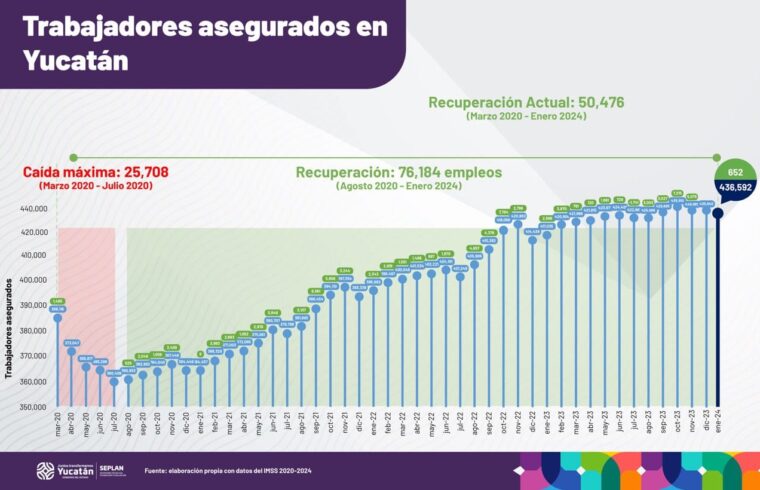 Mérida, Yucatán, 8 de febrero de 2024.- Nuevo registro histórico de trabajadores asegurados ante el Instituto Mexicano del Seguro Social (IMSS) en Yucatán, al registrarse 436,592 en enero pasado, lo que significó un crecimiento anual de 4.7%, en comparación al mismo mes de 2023, lo cual fue un aumento superior al nacional de 3%, como resultado de la promoción y crecimiento económico que impulsa la administración del Gobernador Mauricio Vila Dosal para transformar la vida de las familias yucatecas con mayores y mejores oportunidades.