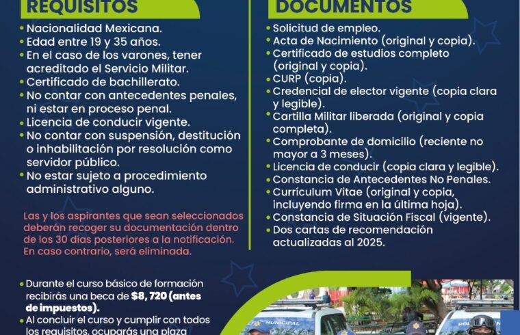 Las personas interesadas en formar parte de nuestro personal operativo es indispensable que cubran los siguientes requisitos: tener de 19 a 35 años edad; contar con certificado de estudios de Bachillerato; en el caso de hombres tener acreditado el Servicio Militar Nacional; aprobar los exámenes de selección; no estar sujeto a ningún proceso penal; licencia de conducir vigente; no contar con suspensión, destitución o inhabilitación por resolución como servidores públicos; y no estar sujeto a procedimiento administrativo alguno.