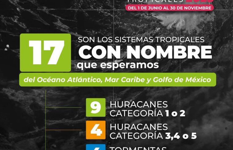 “Según este análisis, en los meses de junio a noviembre, que es el periodo oficial de la temporada de Ciclones en el Océano Atlántico, Mar Caribe Y Golfo de México, se espera la formación de un total de 17 ciclones tropicales con nombre, de los cuales, 9 podrían llegar a convertirse en huracán, categoría 1 o 2. Se contempla que 4 Huracanes llegarían a categoría 3, 4 o 5, y 4 sistemas serían catalogados como Tormentas Tropicales”, puntualizó.