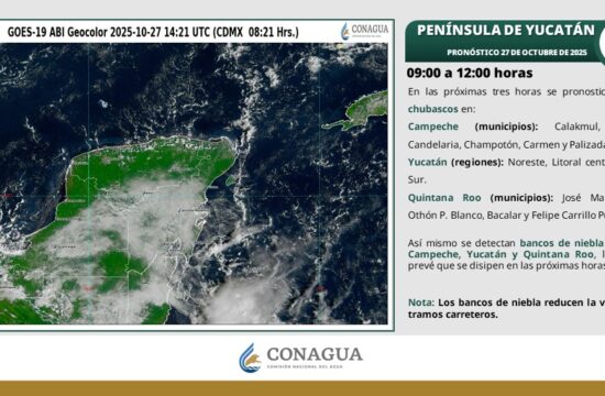 ocasionarán probabilidad para intervalos de chubascos con tormentas en el norte y sur de Quintana Roo, así como chubascos con tormentas puntuales fuertes en el sur y centro de los estados de Yucatán y Campeche. Las temperaturas serán calurosas a muy calurosas en el día y cálidas en la noche, con viento del este-sureste cambiando al noreste de 15 a 25 km/h y rachas de 40 km/h sobre la zona costera de Yucatán y Campeche.