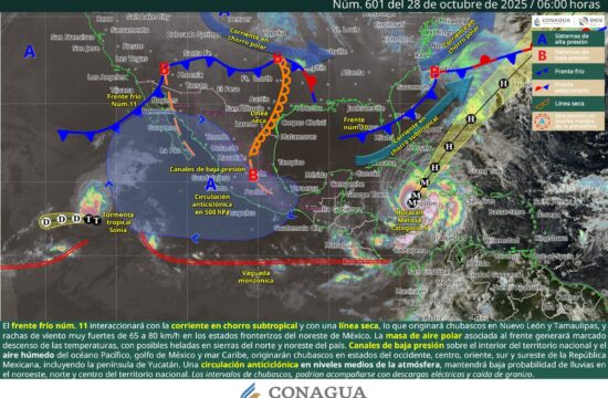 Se prevé cielo despejado a parcialmente nublado, con probabilidad de lluvias aisladas en Yucatán, Campeche y Quintana Roo debido al ingreso de aire húmedo proveniente del mar Caribe y golfo de México. Ambiente caluroso a muy caluroso durante el día y cálido en la noche. Vientos del este-sureste de 15 a 25 km/h, con rachas mayores a 40 km/h.