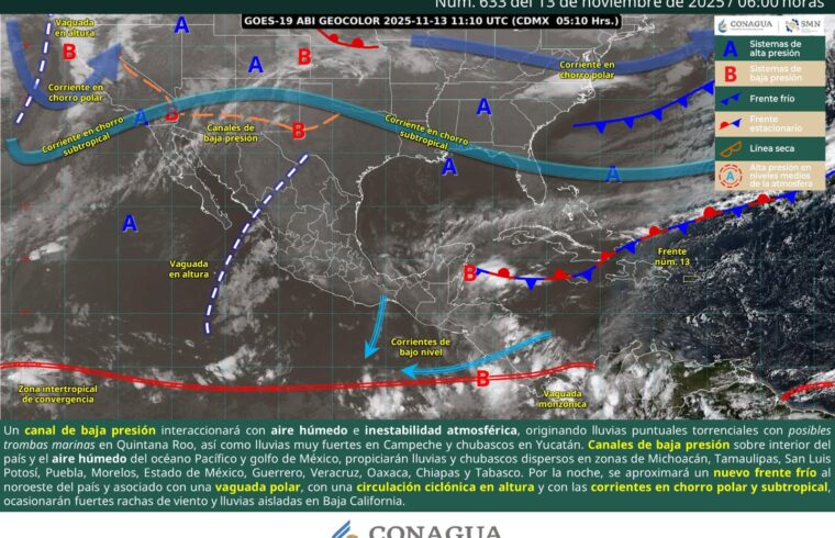 Se prevé cielo parcialmente nublado a nublado, con probabilidad de intervalos de chubascos en Yucatán, tormentas fuertes en Campeche y tormentas intensas a puntuales torrenciales en Quintana Roo debido a una vaguada extendida sobre la costa oriental de la península de Yucatán, en interacción con divergencia en altura. En zonas con tormenta podrían presentarse
