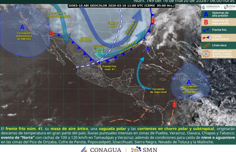 En las próximas 24 horas se prevé cielo parcialmente nublado a nublado, con probabilidad de lluvias fuertes a puntuales muy fuertes en Yucatán y Campeche, así como chubascos y lluvias puntuales fuertes en Quintana Roo. Esto debido a una vaguada inducida por el frente frío núm. 41, y a la posterior llegada del sistema frontal a la región. En zonas con tormenta podrían presentarse descargas eléctricas abundantes, fuertes vientos y caída de granizo (de manera aislada). Por su parte, la masa de aire ártico asociada favorecerá un evento de “Norte”, cuyas rachas podrían alcanzar los 55 km/h y 45 km/h en la costa de Yucatán y Campeche, respectivamente. Ambiente caluroso a muy caluroso durante el día y cálido en la noche.
