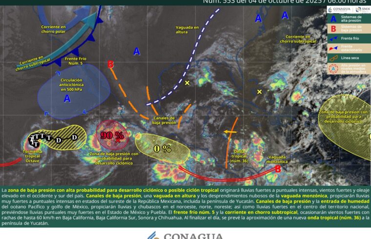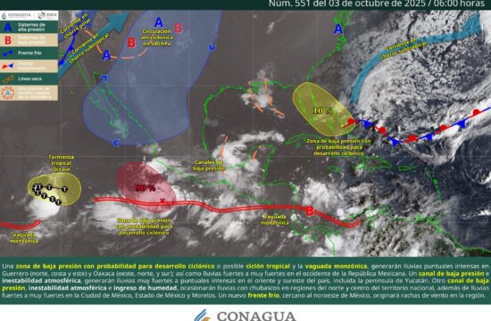 Una extensa vaguada sobre la península y la divergencia en niveles medios y altos de la tropósfera, provocarán lluvias muy fuertes a puntuales intensas en la zona del noreste y sur de Yucatán, centro de Campeche, así como en el norte de Quintana Roo. Los vientos del este-sureste y norte-noreste de 15 a 20 km/h con rachas de 40 km/h en zonas costeras. Además, el ambiente se tornará cálido a caluroso en el día y templado a cálido al amanecer.