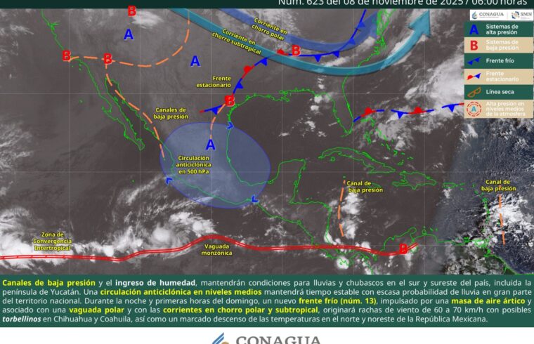 Un canal de bajas presiones sobre la península aunado a la divergencia en altura, estarán dejando chubascos en el centro, noroeste y oriente de Yucatán, norte de Campeche, así como en el centro y norte de Quintana Roo. Los vientos serán del este-sureste cambiando hacia la tarde del noroeste y noreste de 15 a 20 km/h con rachas de 40 km/h en zonas costeras. Además, el ambiente se tornará caluroso a muy caluroso en el día y cálido al amanecer.