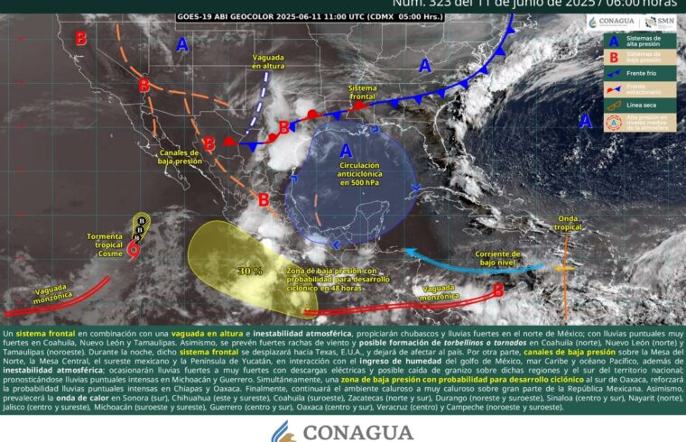 Se prevé que se presenten condiciones de cielo despejado a medio nublado, con probabilidad de chubascos vespertinos con tormentas en los estados
