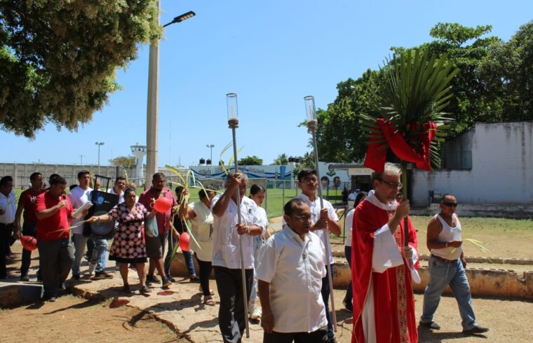 Mérida, Yucatán, 25 de marzo de 2024.- Ayer se celebró el Domingo de Ramos con la procesión de palmas y de esta manera inició la Semana Santa en el Centro de Reinserción Social (Cereso) de Mérida, donde personas privadas de la libertad participaron en esta fecha significativa del calendario litúrgico que recuerda la entrada de Jesús al pueblo de Jerusalén, días antes de ser crucificado.