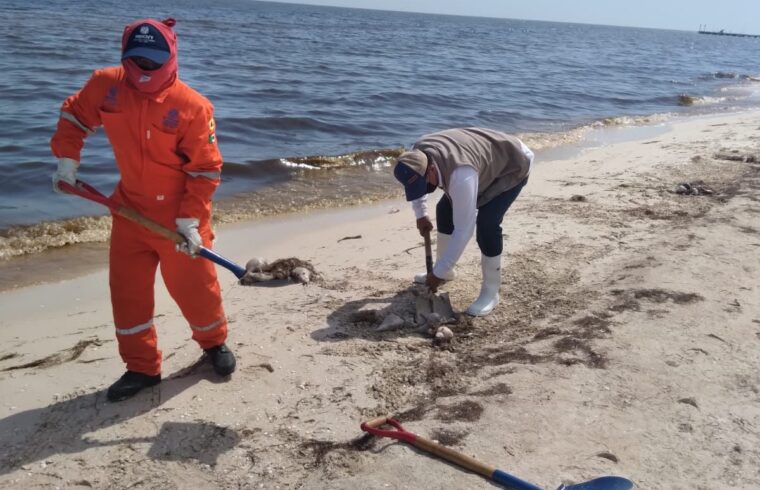 Siguen trabajos de recoja de especies marinas que recalan a la playa por marea roja
