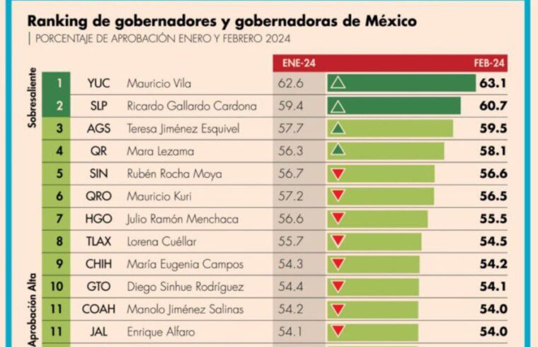 Ciudad de México, 16 de marzo de 2024.- El Gobernador de Yucatán, Mauricio Vila Dosal, continúa como el mejor evaluado del país por segundo mes consecutivo en lo que va de este año, último de su gestión, consolidando su posición como el que con más consistencia ha estado en los primeros lugares de aprobación ciudadana desde que inició su gobierno en el 2018.